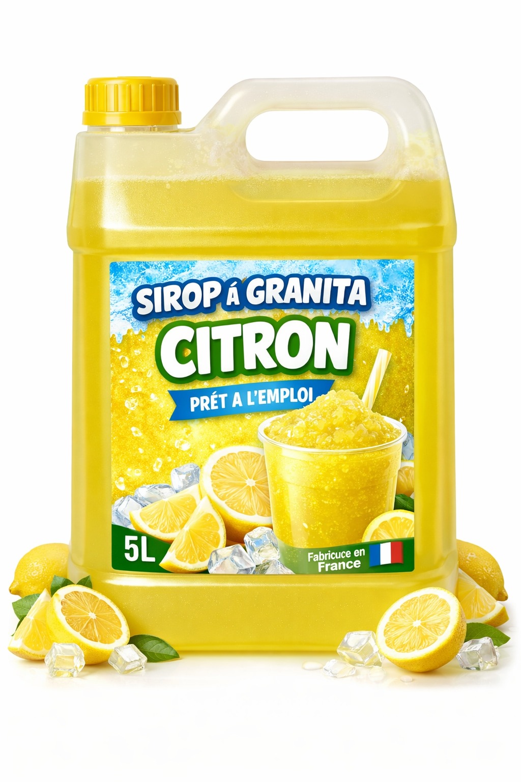 Préparez facilement des délicieux granitas avec notre sirop à granita prêt à l’emploi Citron en bidon de 5L.